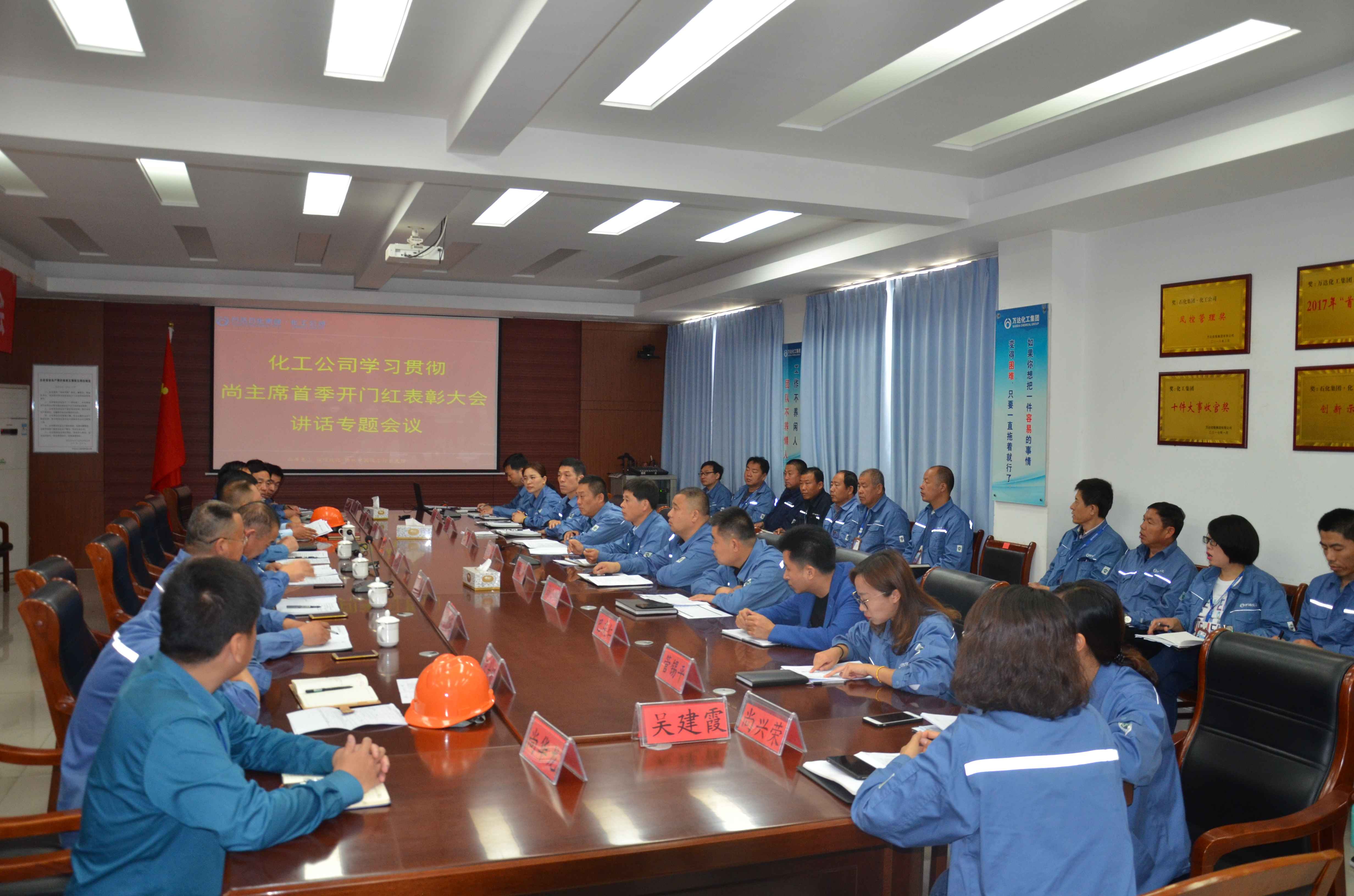 5月6日上午,化工公司在三楼会议室组织召开学习贯彻2019年“首季开门红”总结表彰大会精神专题会议。化工公司董事长韩成功、总经理王洪举、总工程师谢丰鸣、副总经理巴欣民、周光和及各车间、部门负责人参加此次会议。